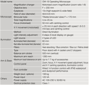 The OM-19 is a high-performance operating microscope designed to meet the quality conditions required for cataract surgery and to cover all other necessary functions. TAKAGI has successfully developed the world’s first operating microscope on which light intensity for red reflex and main illumination can be independently adjusted in response to each particular case and surgeon’s preference. With a broad line-up of options, including a wide-angle fundus observation adapter, with a fundus observation device attached the OM-19 can also be used for retina and vitreous surge.
